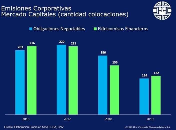 En la modalidad de obligaciones negociables se observó la misma tendencia, resaltó la consultora. En diciembre, se colocaron 18 series, un acumulado de 114 emisiones de deuda en el mercado en 2019, arrojando una disminución de 39% respecto al año anterior.