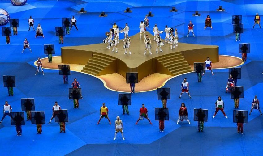 Sobre una lona azul que cubría todo el terreno de juego, con un gran escenario central dorado, un numeroso grupo de bailarines con llamativas ropas de colores con las banderas de los 32 países participantes y unos malabaristas del balón enseñaron sus habilidades con la pelota, mientras se mostraban por unas pantallas algunas de las mejores acciones del Mundial.