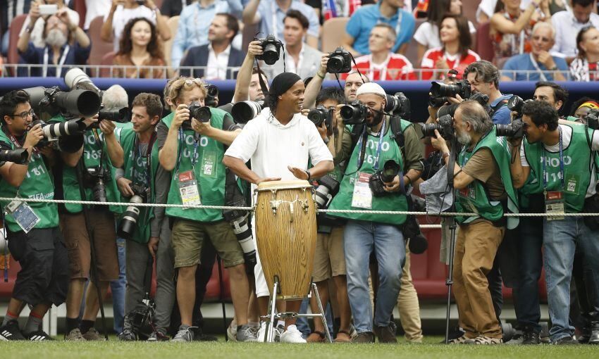 Aunque el momento que más aplaudió el público se produjo justo después, cuando el legendario Ronaldinho apareció en la cancha para acompañar con un tambor tipo yembe la tradicional canción rusa "Kalinka".