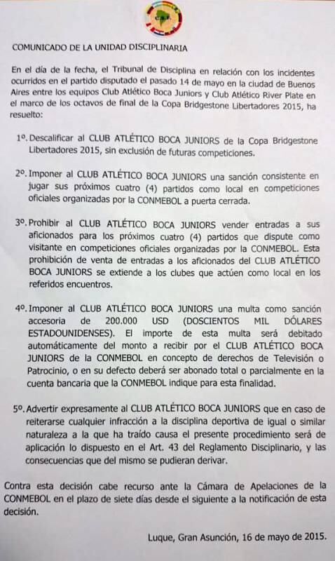 Lo que consiguió la representación de Boca, tras más de siete horas de defender su posición en la sede de la CONMEBOL fue reducir la dureza de la penalización, dado que se especulaba con un año de suspensión para competir en el ámbito continental y dos años de imposibilidad de utilizar La Bombonera en el ámbito internacional.