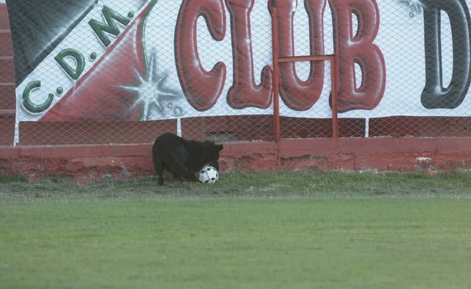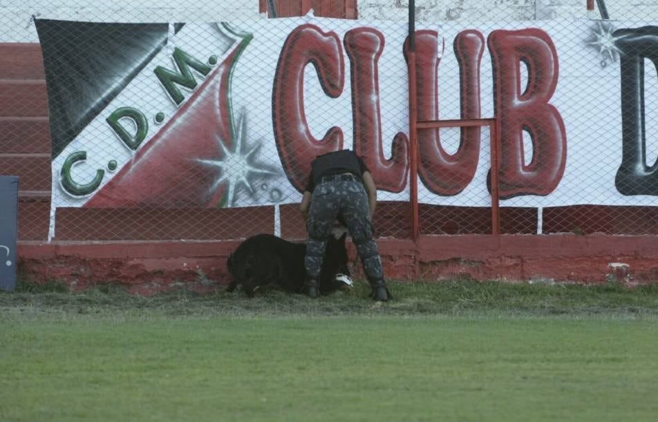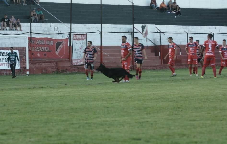 Mientras se disputaba el partido un perro de la policía de Mendoza ingresó al campo de juego se llevó el balón y su "jefe" se lo debió sacar.