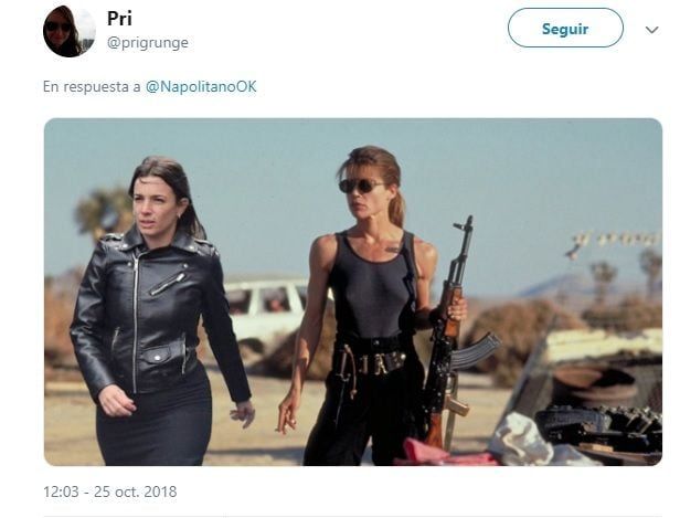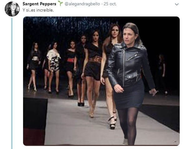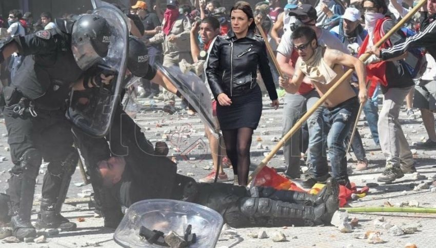La imagen muestra a Lucila caminando con campera de cuero delante de un camión antidisturbios frente al Congreso. Casi de inmediato, usuarios de redes sociales la compararon con personajes de películas de acción.