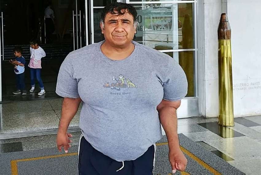 El hombre no llega a los 1,60 metros de altura, pero viste camisetas gigantes como un jugador de fútbol americano. Vestirse es toda una hazaña, ya que sus hombros apenas caben en la ropa y la campera azul que suele utilizar a diario se la hizo un amigo con retazos por doquier.