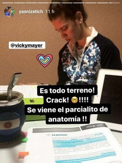 Yamila Nizetich, de 30 años, mostró como ella y Vicky Mayer festejaban la victoria ante las brasileras con los apuntes al frente de su mesa para rendir un parcial.