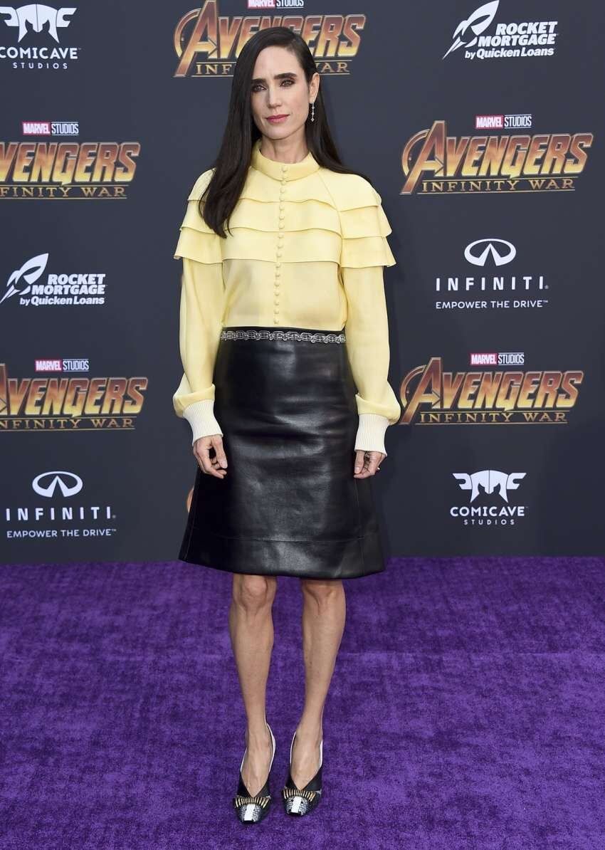 Jennifer Conelly, fanática de Louis Vuitton, apareció con una blusa amarilla de volantes y falda de cuero negra.