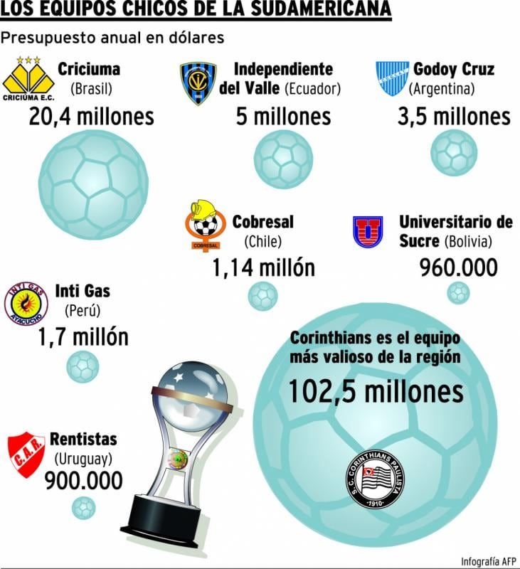 En esa mezcla entre “chicos” y “grandes”, aparecen los extremos de clubes como el Sao Paulo, considerado el tercer equipo de mayor valor del fútbol en América, según la revista Forbes, con un estimado de 260 millones de dólares, y el Universitario de Sucre (Bolivia), cuyo presupuesto mensual es de apenas 80.000 dólares.