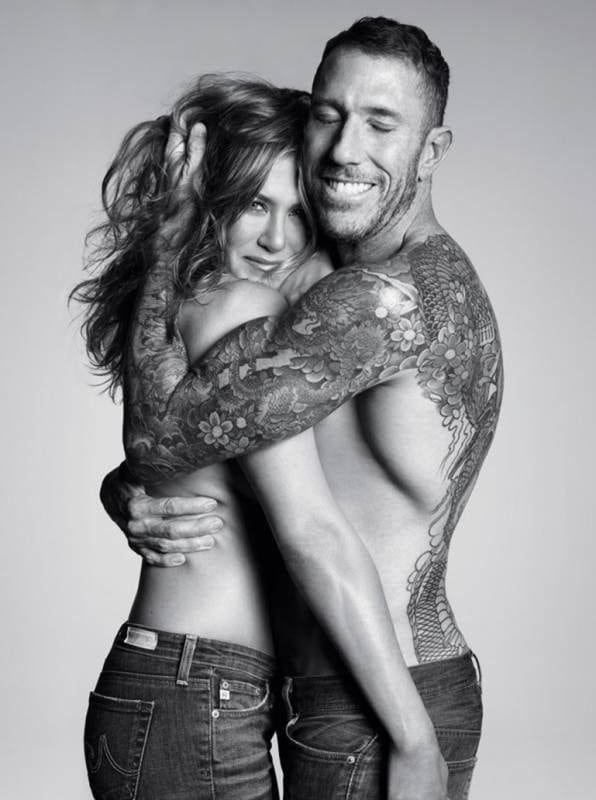En la nota, la protagonista de "Friends" habla de su rol en Cake, donde interpreta a una adicta a los tranquilizantes. En las fotos luce sólo unos jeans y aparece abrazada a su gran amigo, el estilista Chris McMillan, quien fuera el responsable de uno de los looks más recordados de su personaje en la popular serie, Rachel Green.