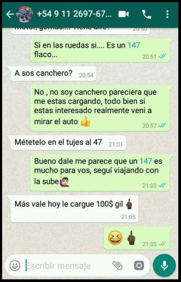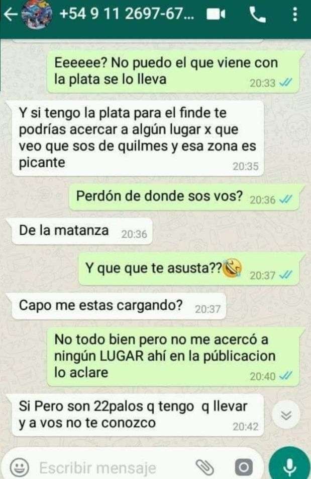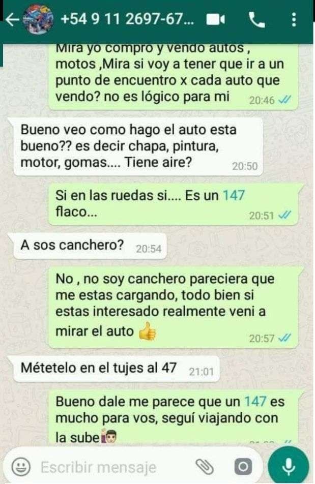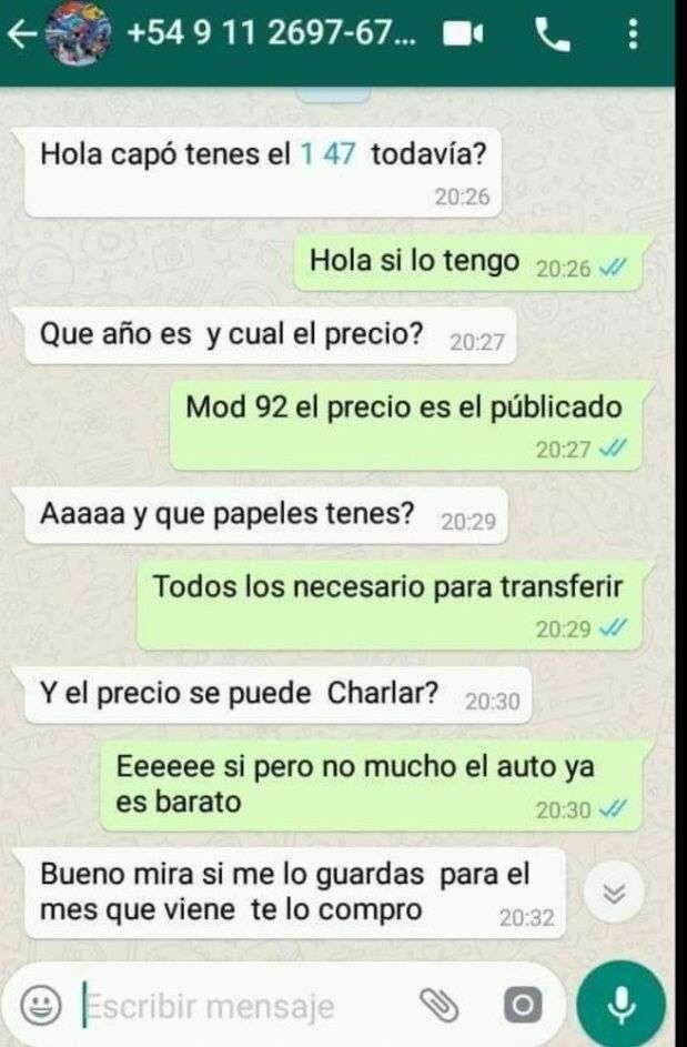 Las capturas de chats corresponden a un hombre que vende un 147 y otro que desea comprarlo en la provincia de Buenos Aires. Pero no este mes, sino el próximo, ya que dice que podrá reunir el dinero recién un poco más de tiempo.