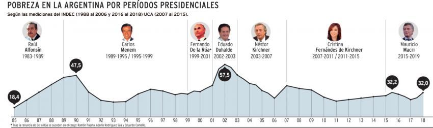 A partir del Rodrigazo (1975), durante el gobierno el gobierno de Isabel Perón y hasta el 32% informado el jueves por el INDEC, la pobreza osciló entre un mínimo del 20% y un máximo de casi el 55% de la población urbana.