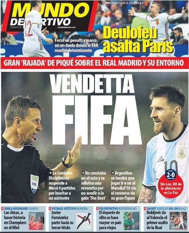 Por su parte, Mundo Deportivo señaló en su tapa "Vendetta FIFA", con una imagen en la que se ve al futbolista argentino con uno de los integrantes de la terna arbitral brasileña que dirigió en el partido ante Chile.