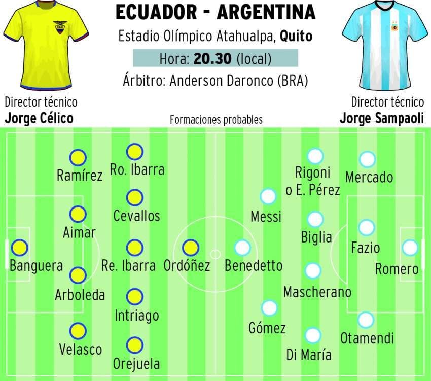 Pensando en el posible desarrollo, Sampaoli probó en las últimas horas con Enzo Pérez (también se mencionó a Pablo Pérez para ese lugar) en el medio por Ever Banega, de floja labor contra Perú y una larga serie de pálidas actuaciones, y Eduardo Salvio un poco más adelantado por Alejandro Gómez, a quien se observó vertical y eléctrico en La Bombonera aunque no desequilibró lo suficiente y tampoco marcó en una clara oportunidad.