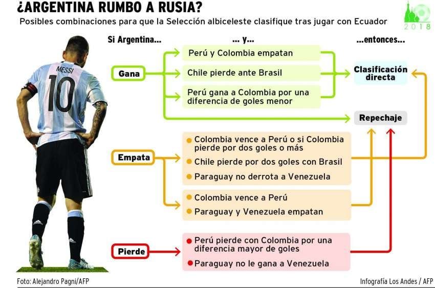 El triunfo albiceleste será el camino para meterse en el repechaje contra Nueva Zelanda o sacar boleto directo a Rusia, si Chile (26) no supera a Brasil (38) como visitante, debido que cualquier conclusión entre Perú (25) y Colombia (26) lo beneficiará en ese contexto.