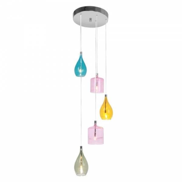 Esta lámpara de techo con cinco pantallas de cristales multicolor, será capaz de alegrar cualquier espacio gracias a su colorido. Es ideal para iluminar una mesa de comedor. Te recomendamos instalarla en un ambiente neutro para que ella sea la auténtica protagonista de la decoración de tu salón.
