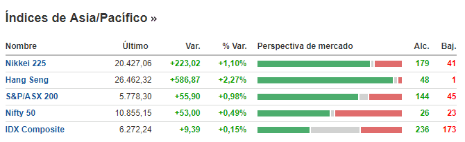 Las bolsas asiáticas cerraron al alza, con el promedio de acciones japonesas Nikkei y el índice CSI de acciones líderes chinas con un incremento de 1%. En tanto, el índice surcoreano KOSPI escaló casi un 2%.