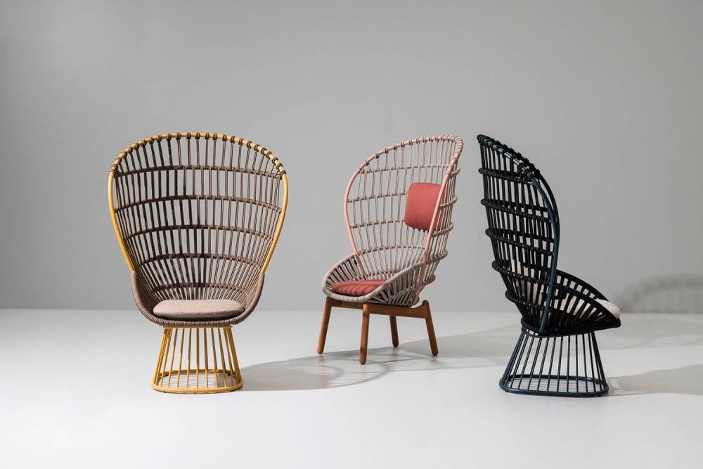 La mecedora “Bird Chaise” presenta una audaz morfología que invita a la comodidad en movimiento.