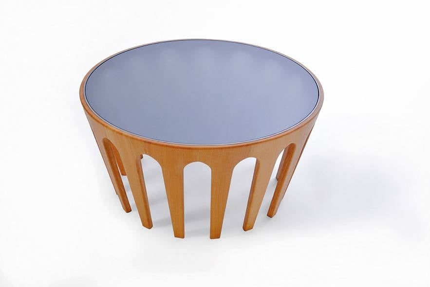 Una mesa apoyada en la idea de la forma de los teatros romanos, con una base calada en roble y tapa espejada.