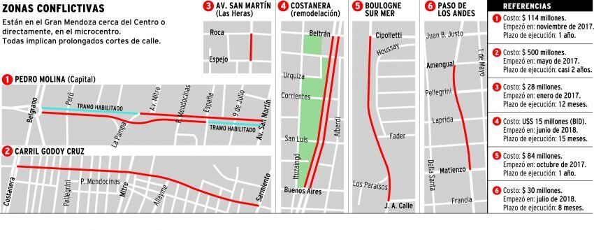 En Ciudad la más importante es la del Paseo Pedro Molina: Se está haciendo una renovación integral de la calle y avanza de a poco. Si bien la obra se encuentra dentro de los plazos previstos -la idea es que esté terminada a comienzos de 2019-, hay situaciones que están complicando la rutina de peatones y conductores.