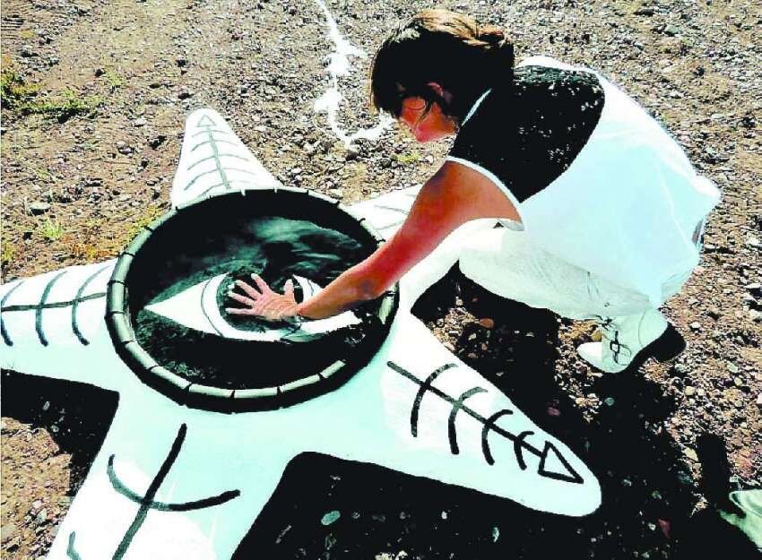 “La obra fue entonces un momento de memoria y evocación para los del más allá. Apunta no sólo a la defensa del agua, del aire, de la tierra. Es una reflexión sobre el ser humano y la intención del ‘consigo mismo’, de su ‘casa’ y de su medida cósmica. Una invitación a reflexionar sobre las acciones -propias y ajenas- que marcarán los destinos de nuestros descendientes. Se toma conceptualmente la mitología de los pueblos originarios andinos pues ellos veneran al agua como un ser con espíritu propio. Fueron nueve discos colocados en la superficie del lago flotando en silencio en la superficie. En el centro de cada uno, flamas que representan el aliento intestinal de la Pachamama y otros con los ojos observando hacia el cielo”, comparte.