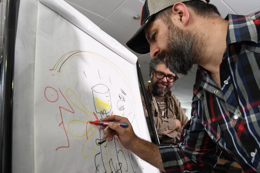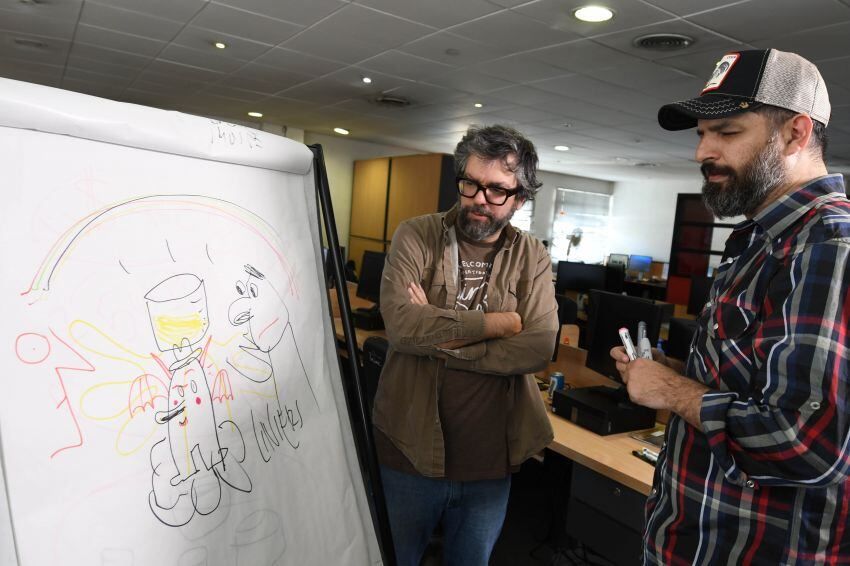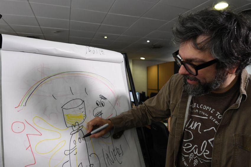 -L: Lo que cambia es la velocidad. Me parece que hay un vértigo, una adrenalina y una cosa del momento que no está obviamente cuando estamos sentados en nuestro cuarto tranquilos y relajados. Podés pensar cual es la mejor palabra para tal chiste, para tal momento y por ahí cambiás algo y funciona mejor. En el escenario no tenés tiempo de eso, todo sucede como a toda velocidad y eso genera también otro tipo de humor, y lo lindo, que creo que es algo que disfrutamos los dos, es que nos vamos del humor que hacemos muchas veces en los dibujos hacia otros un poco diferentes.