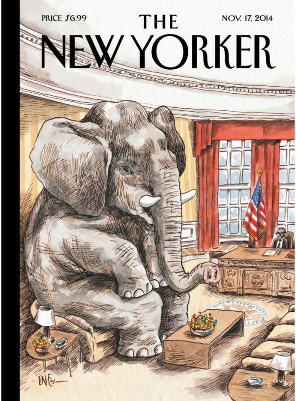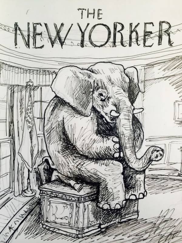 El artista argentino representó a la situación de Obama y llevó a su dibujo a la portada de The New Yorker, una de las revistas más prestigiosas de Estados Unidos. Su idea original fue hacer un elefante que estaba sentado sobre Obama, según relató él mismo. Pero el dibujo fue cambiado por uno un poco más sutil. Se ve el elefante y al Presidente de EE UU sentado en su despacho.