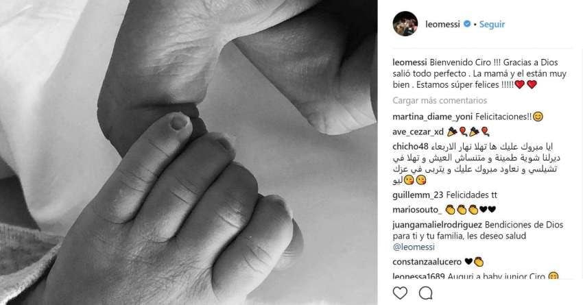 Leo Messi confirmó de forma oficial el nacimiento de Ciro, con una imagen que publicó en Instagram en la que aparece dando la mano al pequeño recién nacido. En la foto, Messiacompaña el siguiente mensaje: “Bienvenido Ciro !!! Gracias a dios salió todo perfecto. La mamá y el están muy bien . Estamos súper felices !!!”.