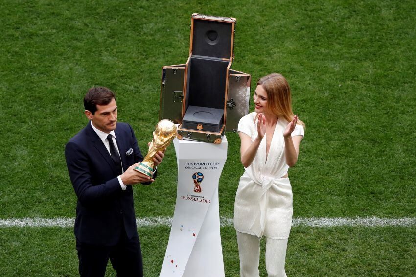 El español Iker Casillas, campeón mundial en 2010, dio el pistoletazo de salida a la fiesta minutos antes de su inicio al traer al campo el trofeo que levantará en este mismo estadio el ganador del torneo.