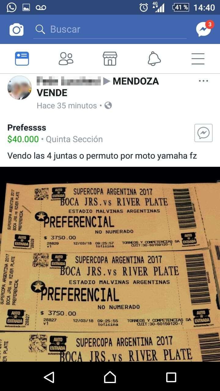 El flagelo de la reventa de entradas no tiene fin en el fútbol argentino. Ahora apareció un usuario en Facebook ofreciendo 4 plateas preferenciales para el superclásico entre Boca y River a $40000. Es más, hasta acepta una moto a cambio.