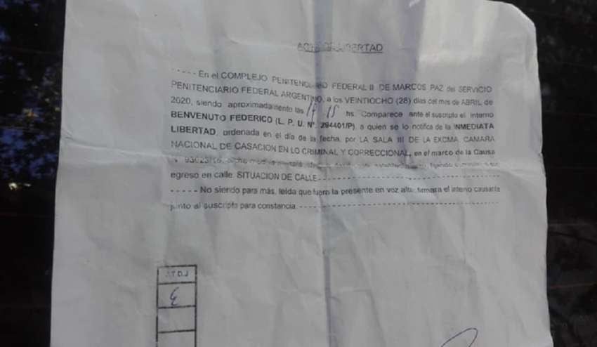 Los oficiales se llevaron la sorpresa al encontrar un papel en los bolsillos de Benvenuto: efectivamente había sido liberado del penal. El sujeto le dijo a los policías: "Qué me importa que me lleven preso, ayer (por el martes) salí del penal de Marcos Paz por el coronavirus. Llevame, igual mañana (por el jueves) me voy de nuevo".
