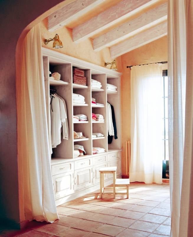 ¿Barrales, cajones, estantes? Lo mejor es que tengas un poco de todo. Los cajones son más útiles para los complementos o elementos más pequeños, como lencería, medias, pañuelos, cinturones, etc. Los barrales son imprescindibles, porque hay mucha ropa que necesita ser colgada si no querés que acabe hecha un trapo. Los estantes también son importantes, pero, eso sí, sé práctica y utilizá las que tienen peor acceso, es decir las superiores, para guardar la ropa que no te ponés -la de invierno en verano, por ejemplo- y las más bajas para las prendas más funcionales. Además si tenés una buena colección de zapatos, tendrás que colocar estantes inclinados, especiales para ellos.