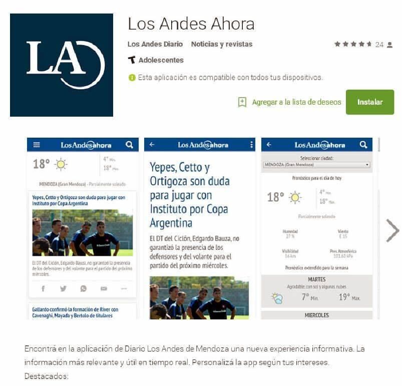 A tono con los vertiginosos cambios en Internet, el diario que fue el primero de Argentina en estar en red siempre se renueva. Por eso, desde el año pasado ofrece la app Los Andes Ahora: los usuarios pueden enterarse de alertas relevantes para la vida cotidiana, como cortes de calle, apertura y cierre de rutas o suspensiones de clases.