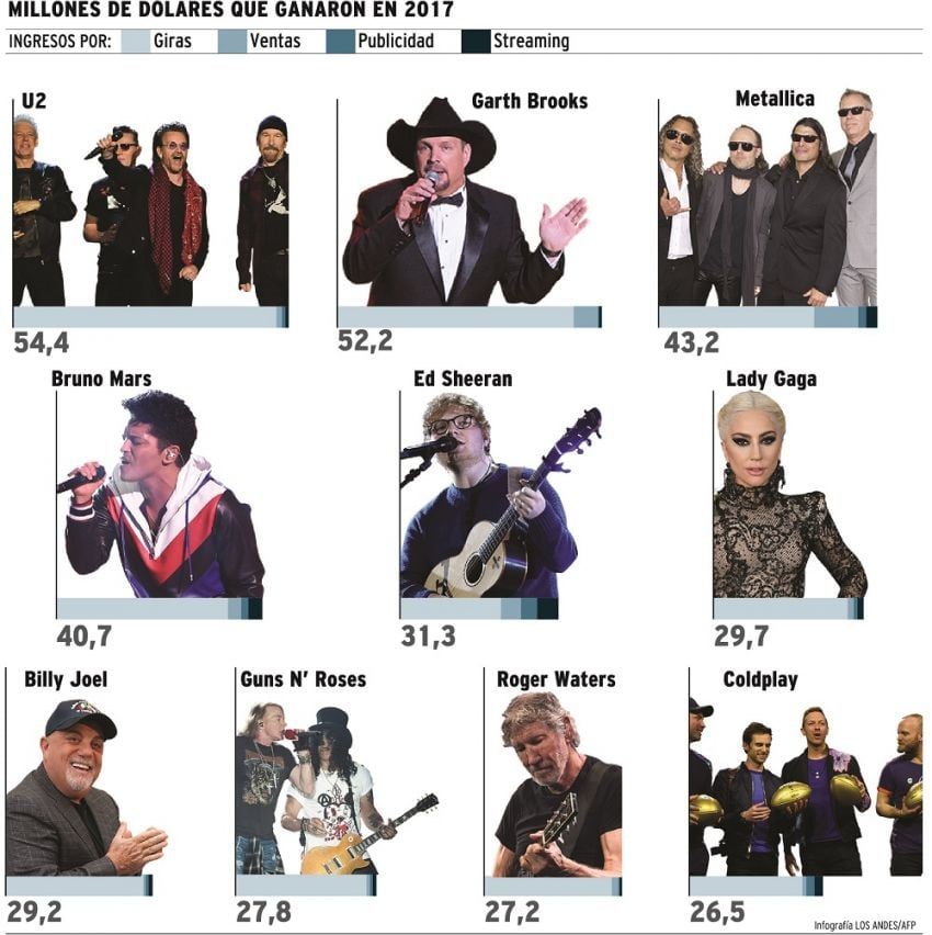 Como puede verse con detalle en la infografía, a la cabeza está el grupo irlandés U2. Fueron alrededor de 54,4 los millones de dólares que recaudó en suelo estadounidense. El 95% de él gracias a la gira, en la que se conmemoró el trigésimo aniversario de "The Joshua Tree", álbum legendario.
