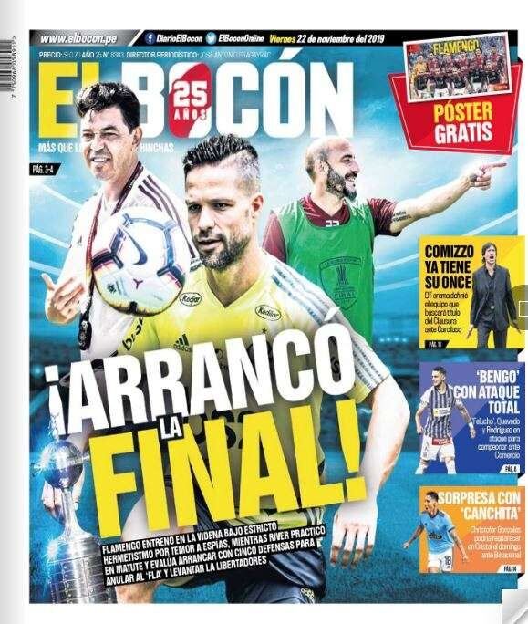 Para El Bocón, "¡Arrancó la final!", según su tapa, con la figura del volante Diego Ribas, escoltado por el DT de River, Marcelo Gallardo, y el defensor Javier Pinola.
