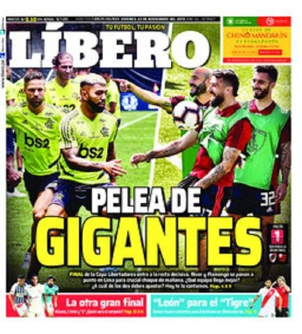 Los diarios deportivos del Perú palpitan "la gran final" de la Copa Libertadores que River y Flamengo de Brasil jugarán mañana en el estadio Monumental de Lima como eje central de sus portadas.