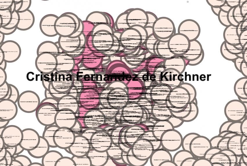Para finalizar con Facebook, analizamos los actores de sus audiencias para descifrar el círculo íntimo de CFK en Facebook desde la creación de su cuenta. Podemos observar cómo las audiencias giran a través de su cuenta e identificar en el gráfico de nodos, un grupo de actores principales muy cerca del centro de la escena.