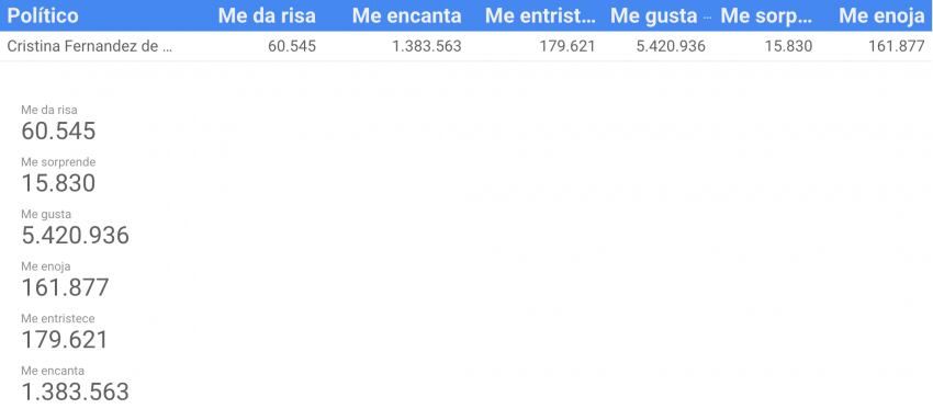 Los sentimientos positivos prevalecen por sobre los sentimientos negativos en todos los posteos de CFK con una gran brecha: 6.804.499 reacciones positivas frente a las 417.873. Este panorama cambia luego de los Cuadernos de la Corrupción: a pesar que las reacciones positivas siguen prevalenciendo, las reacciones negativas marcaron un crecimiento del 11%.
