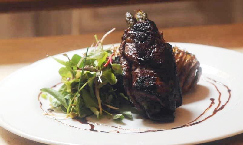 Lomo relleno de espárragos y jamón crudo con papas Hasselback (4 porciones)