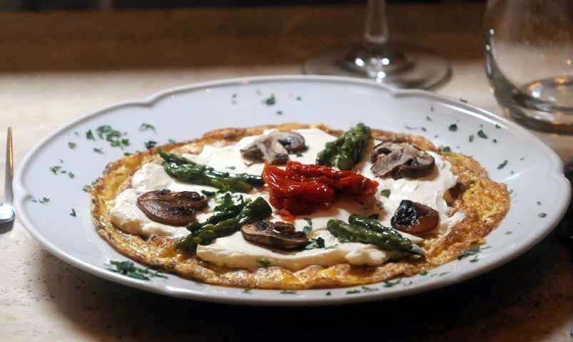 Omelette abierto de espárragos, champiñones, tomates secos y queso crema (4 porciones)