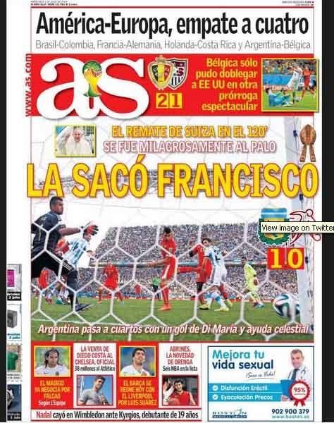 Los medios del mundo hablan del sufrido triunfo de la selección ante Suiza, y la mayoría hace hincapié en el palo que salvó a Argentina. Aseguran que detrás de este “milagro” está el papa Francisco.