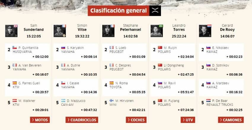 Hasta el momento los líderes de la competencia son: el francés Stéphane Peterhansel (Peugeot 3008 DKR) en autos; el británico Sam Sunderland (KTM) en motos; el francés Simon Vitse (Yamaha) en cuatriciclos y el holandés Gerard De Rooy (Iveco) en camiones.