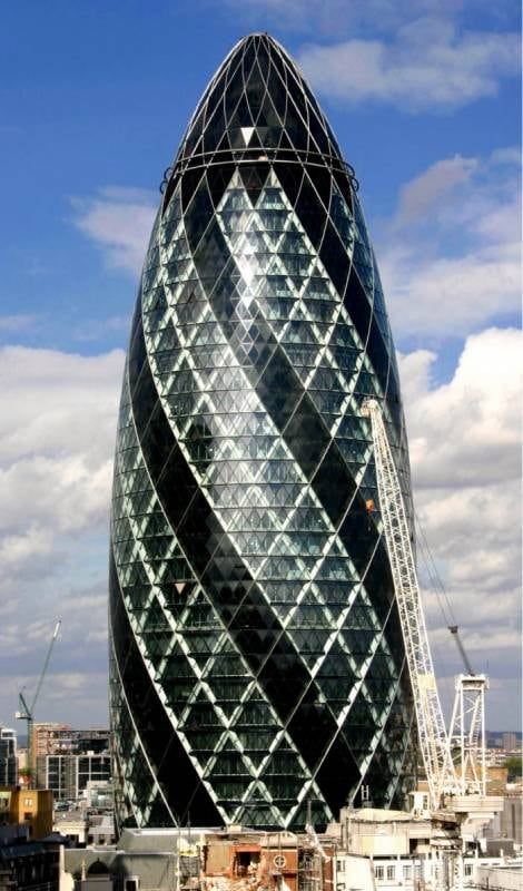Es un rascacielos ubicado en el distrito financiero de Londres, Inglaterra. Mide 180 metros de altura y es conocido como "el pepinillo" (Gherkin) debido a su figura redonda y alargada.