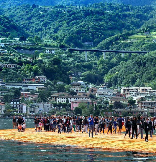 El genial artista Christo regresó para sorprender con su instalación Muelles flotantes (The Floating Piers), una pasarela de casi 3 kilómetros de largo que se extiende sobre el Lago italiano Iseo. Los transeúntes experimentan la inconcebible noción de caminar sobre el agua en un larguísimo trayecto que comunica la ciudad costera de Sulzano con dos islas contiguas.