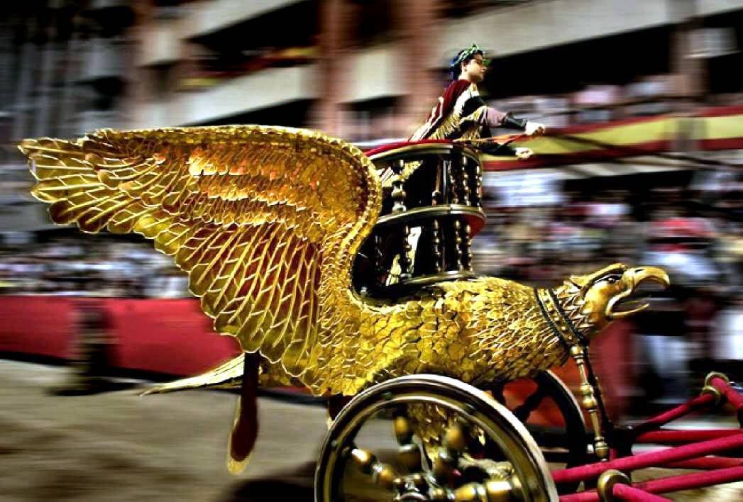 La Carrera es el nombre del gran desfile. De él participan los ciudadanos vestidos de emperadores romanos, tropas egipcias, dioses romanos en pesadas carrozas, cuadrigas y caballistas.