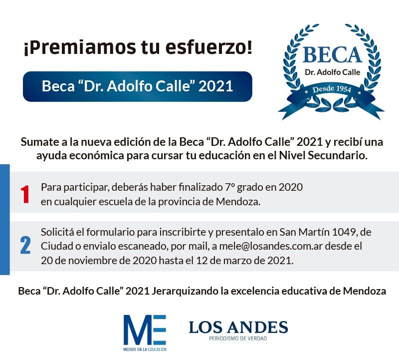 La Beca “Dr. Adolfo Calle” fue creada en 1954 con el objetivo de contribuir a la calidad y el desarrollo educativo de la provincia, y de estimular la comunicación entre la escuela y su entorno.