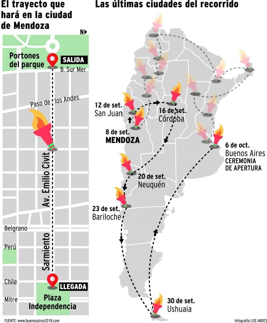 Más de 9.000 kilómetros lleva recorrida la llama de la juventud en su travesía por el suelo argentino. Después de iniciar su camino el pasado 5 de agosto en La Plata, el fuego sagrado ya iluminó el mar Argentino, visitó sitios icónicos de la geografía argentina como las Cataratas del Iguazú, las Salinas en Jujuy y luego del paso por el noroeste llega a la región de Cuyo. En total 13 mendocinos tendrán el honor de trasladar el pebetero entre quienes hay ex deportistas olímpicos, referentes sociales y atletas con capacidades diferentes.