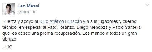 "Fuerza y apoyo al Club Atlético Huracán y a sus jugadores y cuerpo técnico, en especial al Pato Toranzo, Diego Mendoza y Pablo Santella que les deseo una pronta recuperación. Les mando a todos un gran abrazo", escribió 'Leo' en su página oficial de Facebook.