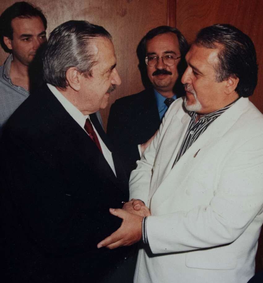 Momento histórico. Durante el cierre de campaña de las elecciones a presidente en Mendoza en 1983, Pocho cantó “Gracias, esperanza” y en el backstage el cantante fue retratado en un caluroso apretón de manos.