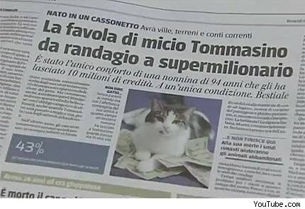 Tommaso. Es el gato más rico del planeta. Cuando murió su dueña se quedó con nada menos que 10 millones de euros. Además de propiedades en Milán y Roma. Hoy vive en una mansión donde es atendido por empleados.