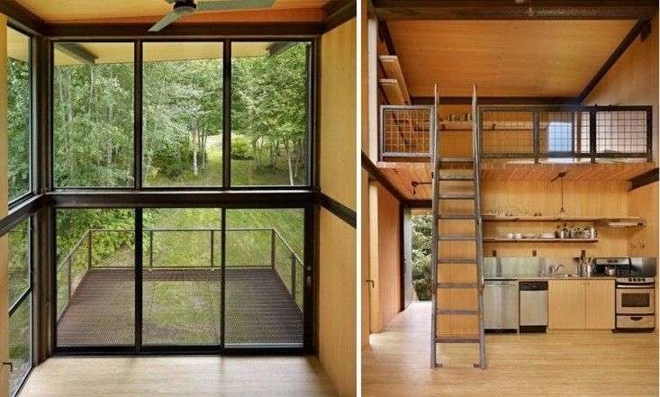 Su interior trata de maximizar el poco espacio disponible. Dividida en dos zonas; en la zona baja encontramos un salón comedor con cocina americana y estufa de leña un espacio abierto al porche. En el altillo encontramos uno de los dormitorios. Los techos, paredes y suelos son de madera, así como su mobiliario y sus estanterías.