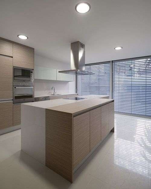 Su interior es simple, moderno y muy funcional. Las líneas sobrias y los tonos en madera crean un ambiente relajado y ciertos toques de estilo nórdicos. Una característica de esta casa es que el azul Klein otorga continuidad a los espacios.