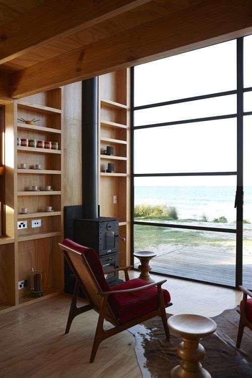 Los arquitectos Crosson Clarke Carnachan Architects proyectaron una cabaña en la que una familia de 5 personas debían convivir en 48 metros cuadrados, todo un reto. Se trataba de un trabajo en el que el cliente pedía un diseño simple, pequeño, funcional y sobre todo que respetase y se integrase con el entorno natural de las playas de Nueva Zelanda. Por ello su revestimiento es de madera vista.